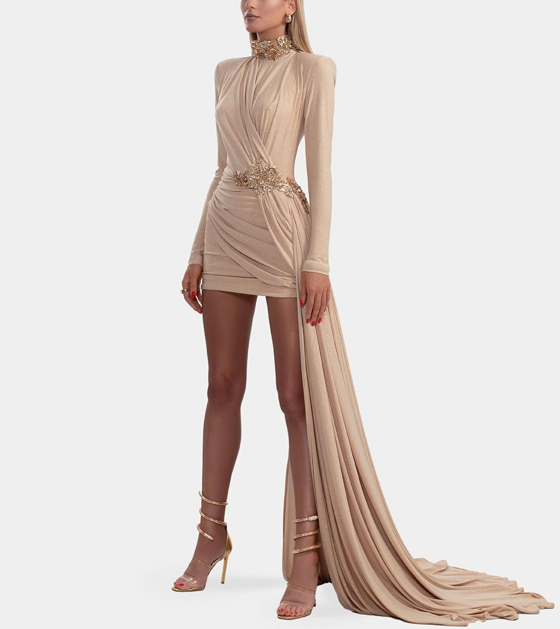 Albina Dyla Long Sleeve Mini Drape Dress - Nude