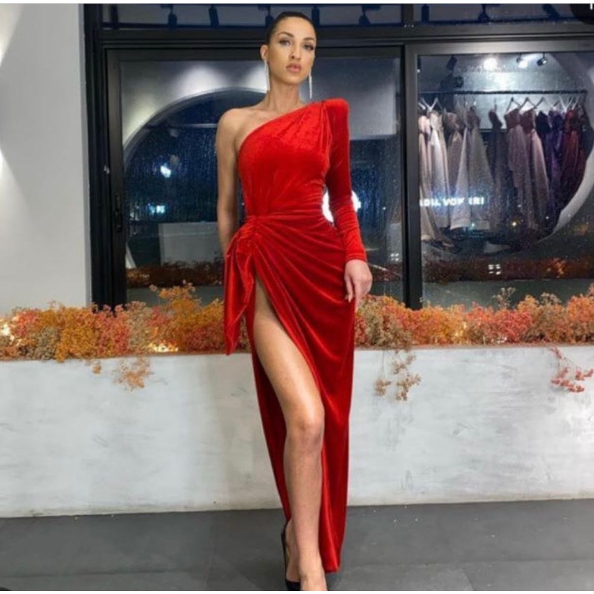 Lia Stublla One Sleeve Velvet Gown - Red