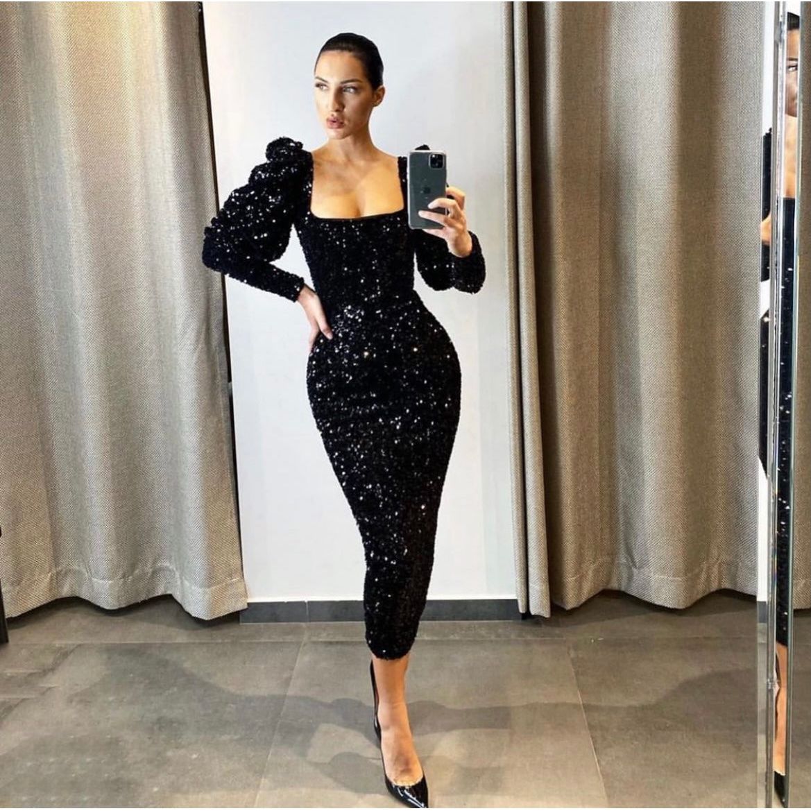Lia Stublla Sequins Puff Sleeve Midi - Black